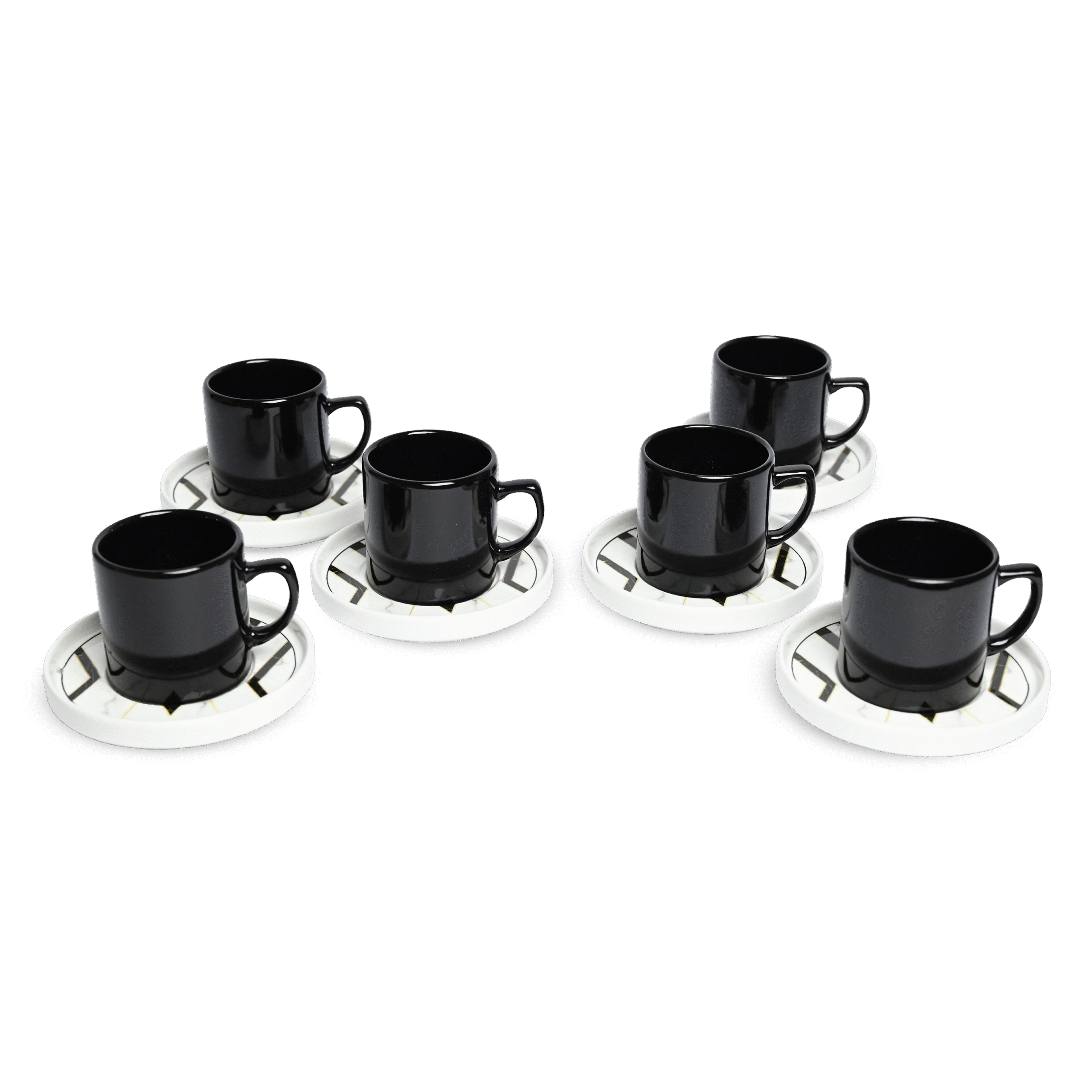 Serve your beverages in modern style with this Black Ceramic Cup & Saucer Set. Featuring glossy black cups and designer geometric saucers, this 12-piece set adds elegance to any table setting.