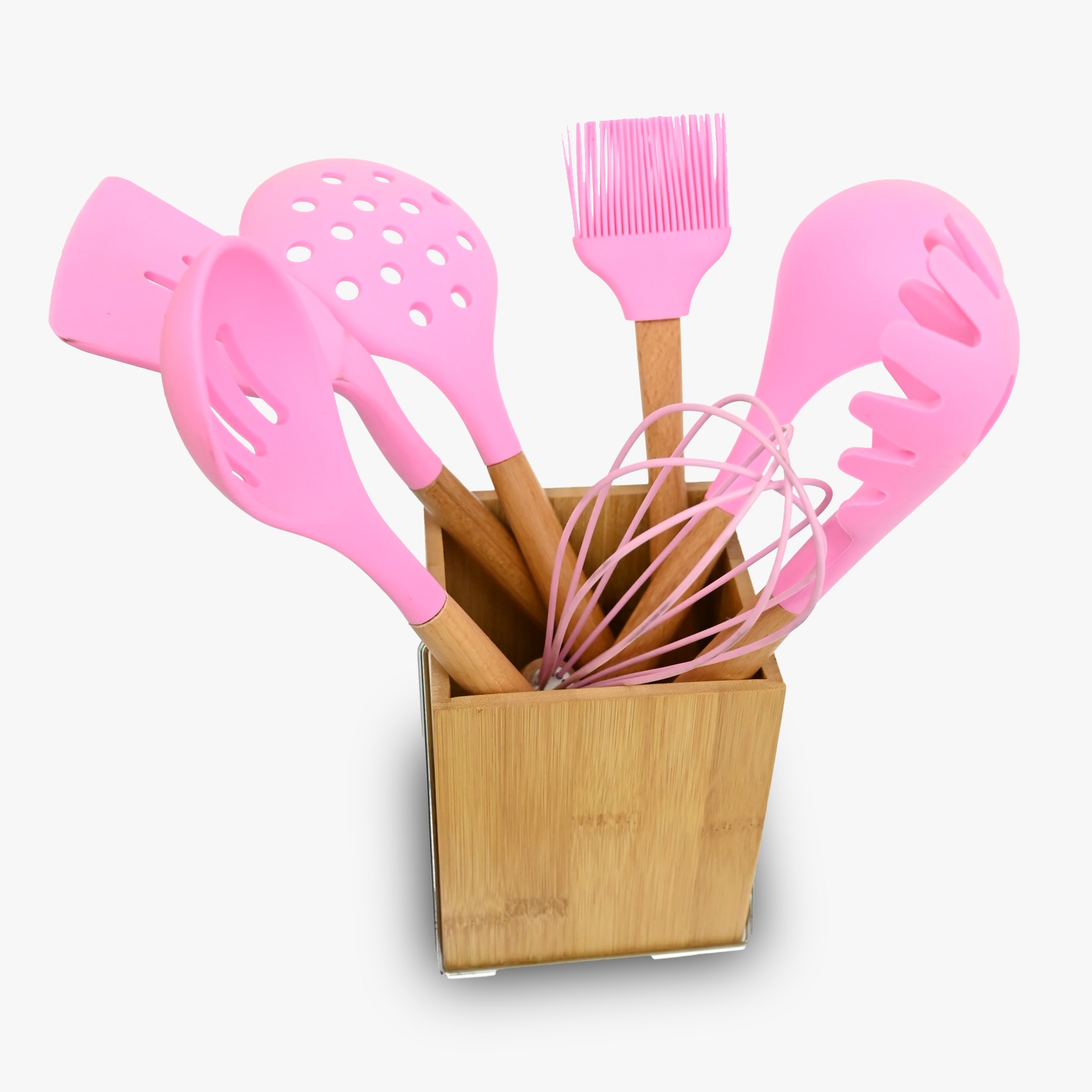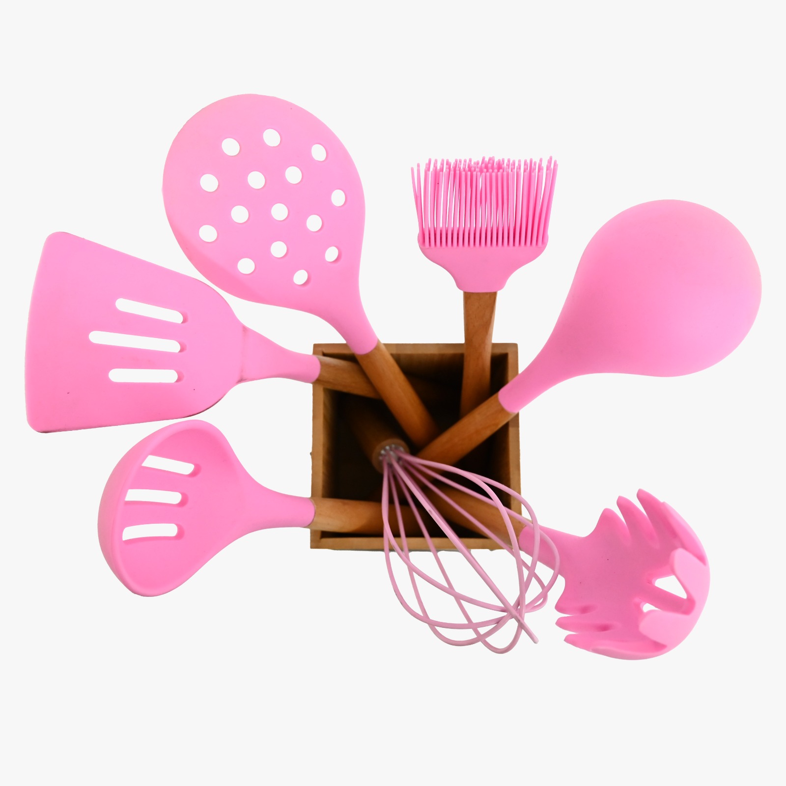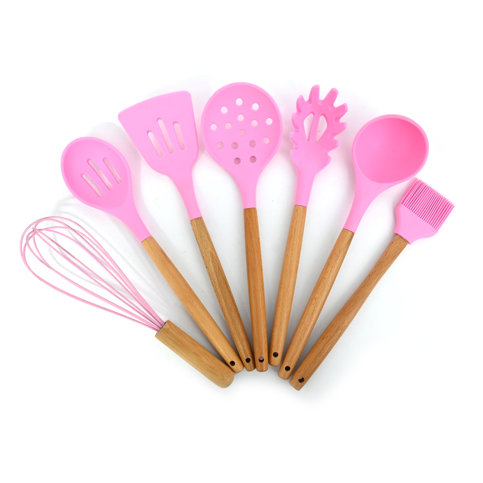 7 Pcs Silicone Kitchen Utensil Set with Wooden Handles | Pink