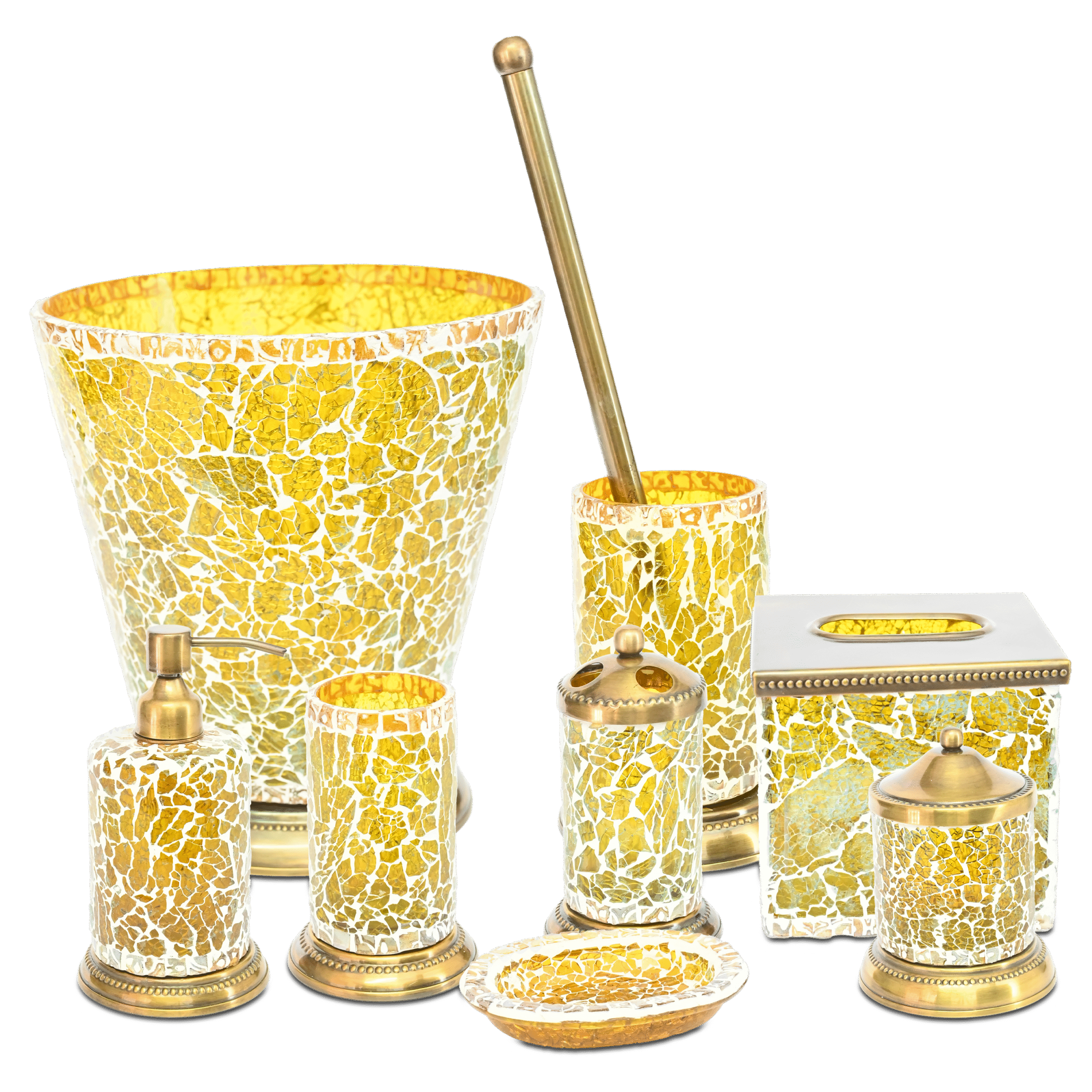 A stunning luxury gold mosaic bathroom accessories set featuring handcrafted-style glass mosaic with antique gold accents. Designed to bring elegance, warmth, and sophistication to any bathroom space.