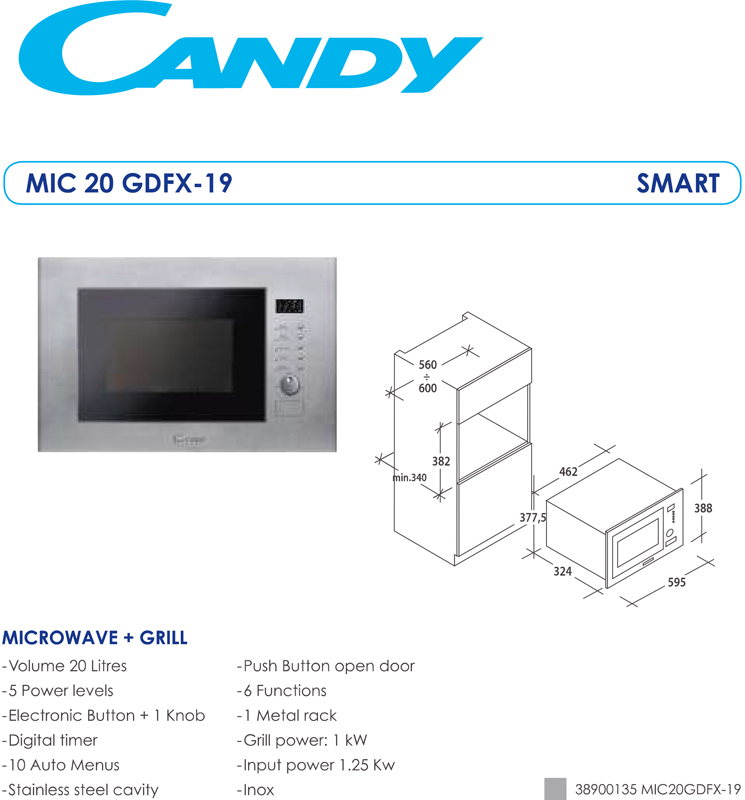 Candy MIC20GDFX-19 Built-In Microwave with Grill | 20L Stainless Steel Microwave Oven | UAE