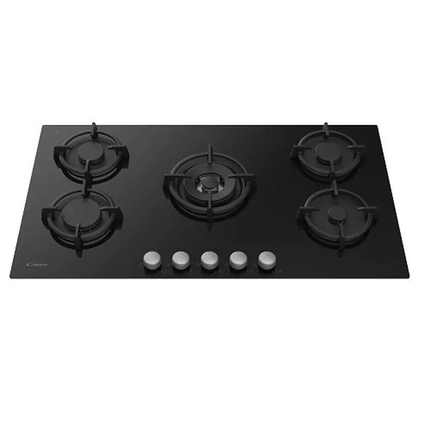 Elevate your kitchen with this sleek 90 cm built-in gas hob, featuring five burners, black tempered glass surface and cast-iron pan supports for professional-level performance and style.