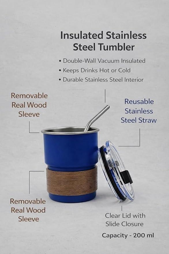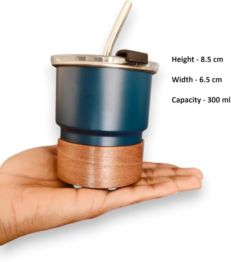 Dark Navy Blue | Insulated Rust-proof Lightweight Stainless Steel Tumbler with Lid & Steel Straw | Wooden Grip Coffee Cup | Reusable Hot & Cold Beverage Mug for Cafe, Office & Travel
