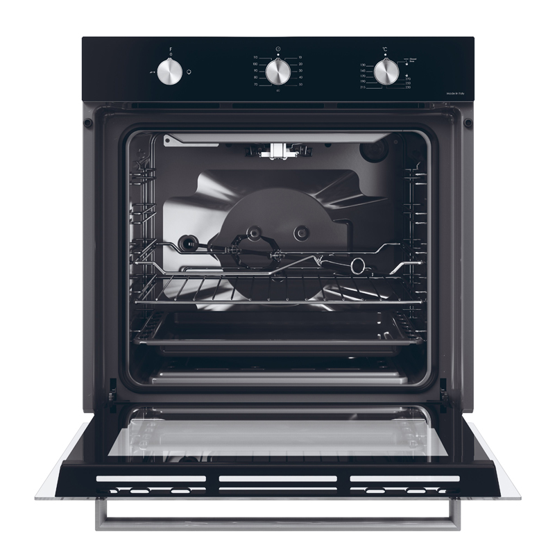 Experience professional-grade cooking with this 60cm Full Gas Oven (Gross 84L / Net 71L). Designed in sleek black and Made in Italy, it offers precise control with 3 knobs, a minute minder, and turnspit for perfect roasting. Features external fan cooling for safety and consistent performance — ideal for modern kitchens seeking power, style, and reliability.