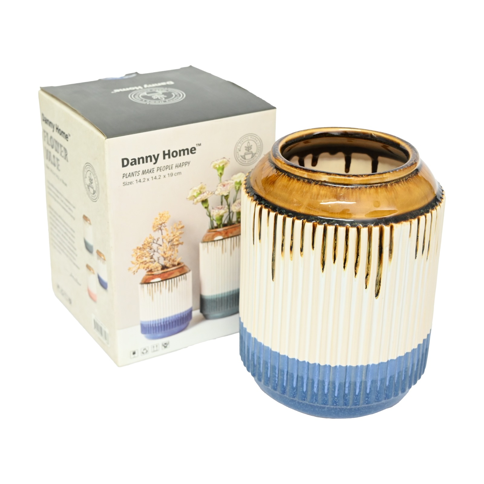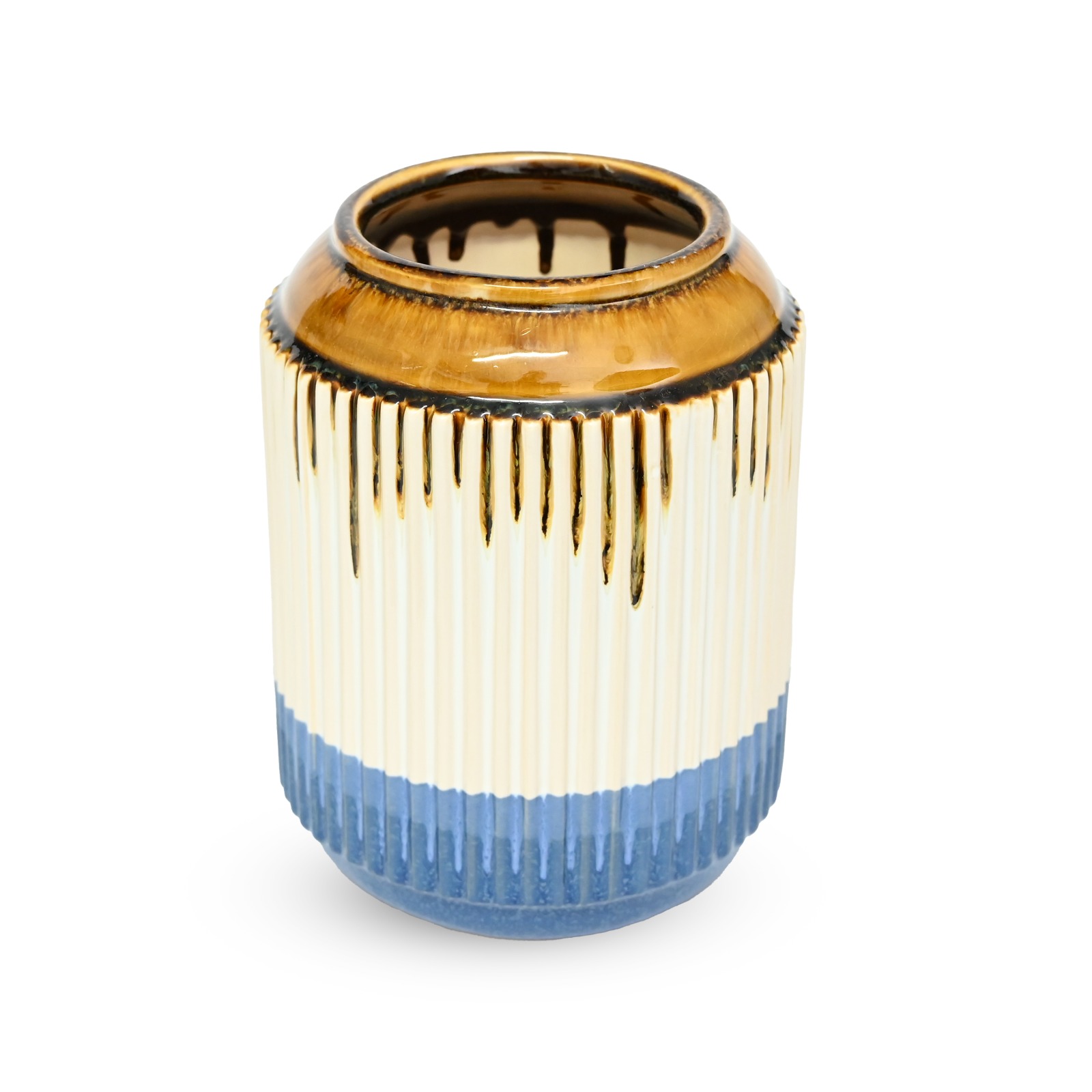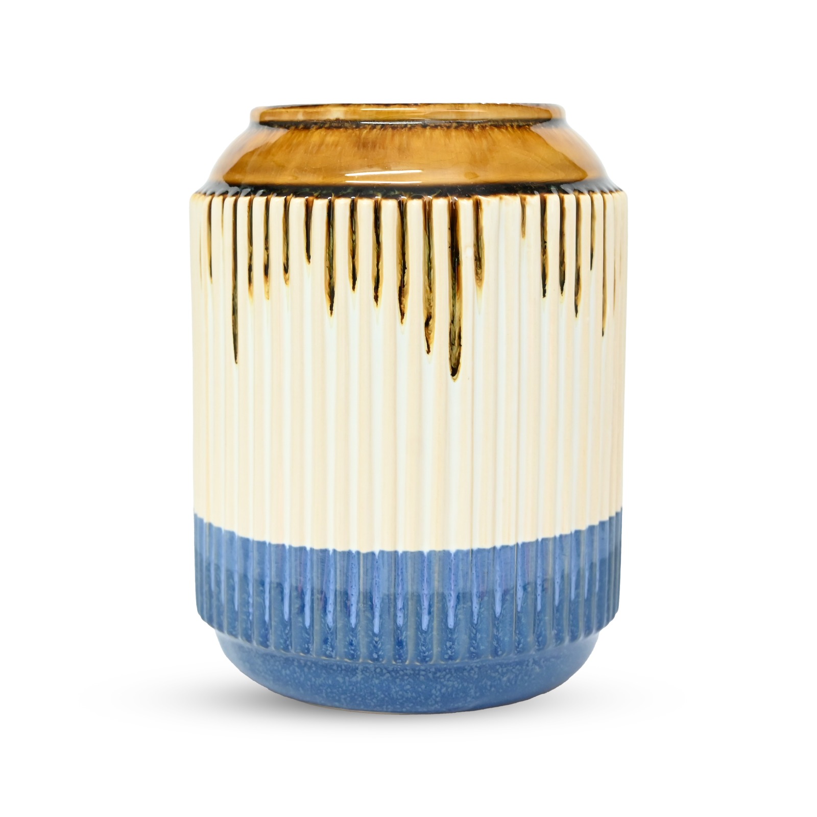 This ceramic flower vase features a modern cylindrical shape with a ribbed texture and a beautiful gradient blend of glossy brown, clean white, and deep blue. Made from durable ceramic, it is ideal for displaying fresh flowers, dried stems, or artificial arrangements. Its stylish design enhances consoles, dining tables, shelves, and office spaces. The elegant color combination adds sophistication to any interior, making this vase a versatile decorative piece or a thoughtful gift for special occasions.