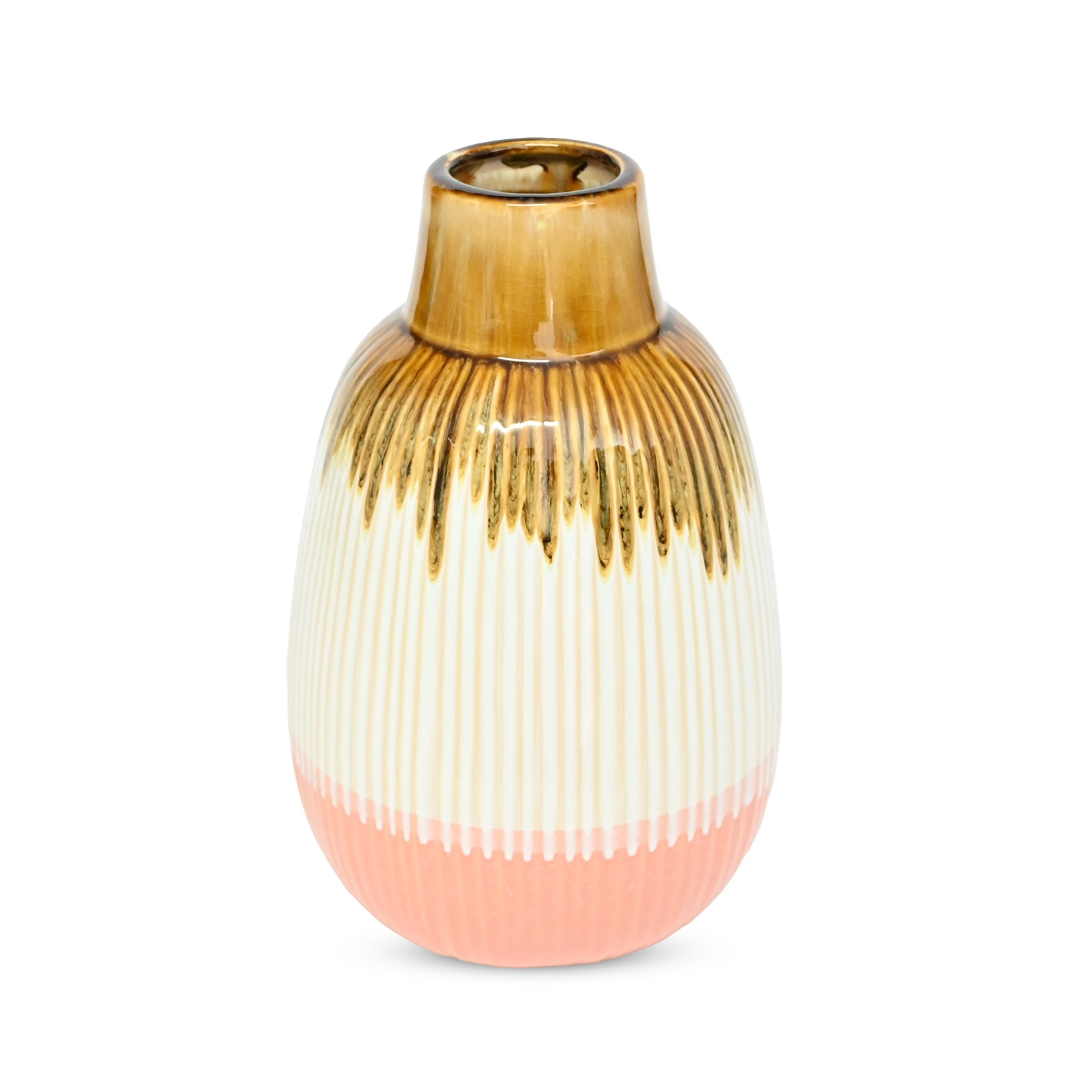 A round ceramic vase featuring a ribbed texture and a soft gradient of brown, white, and peach—perfect for stylish home décor and floral arrangements.