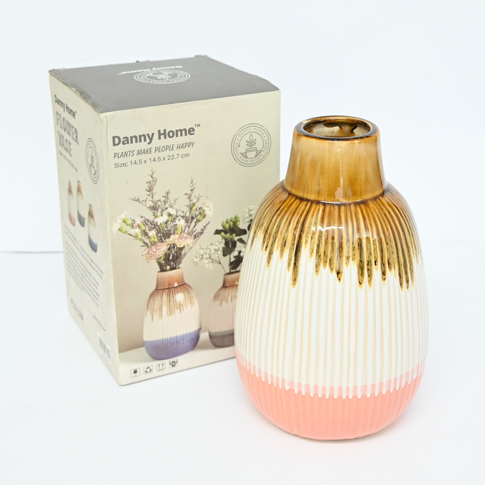 The Danny Home Ceramic Flower Vase features a stylish blend of warm brown, white, and soft peach-pink tones, making it a perfect decorative centerpiece for living rooms, bedrooms, offices, or dining areas.