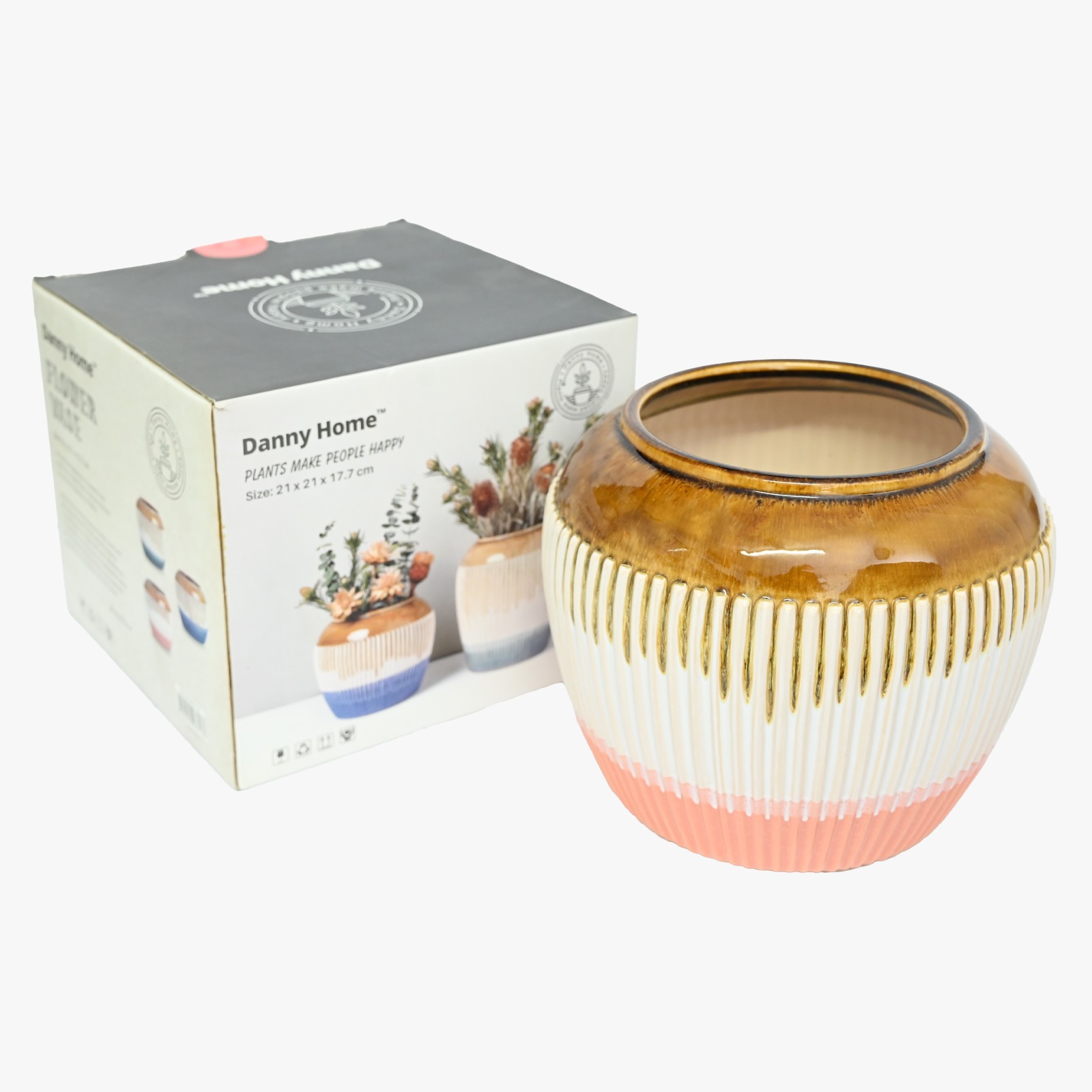 This ceramic flower vase features a charming round shape with a ribbed textured body and a beautiful gradient blend of glossy brown, crisp white, and soft peach. Crafted from high-quality ceramic, it is ideal for fresh flowers, dried stems, or artificial arrangements. Its unique rounded form enhances consoles, coffee tables, shelves, and office spaces. The warm color transition adds elegance and charm to any interior, making this vase a versatile décor piece and a thoughtful gift option.