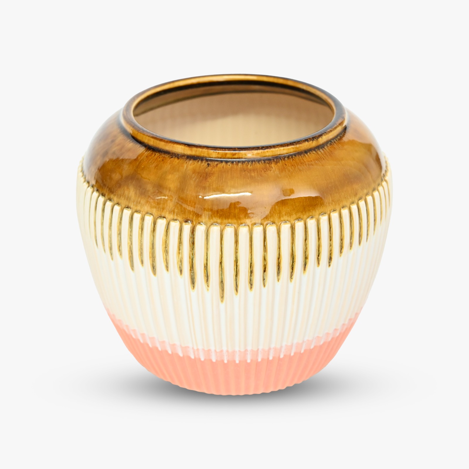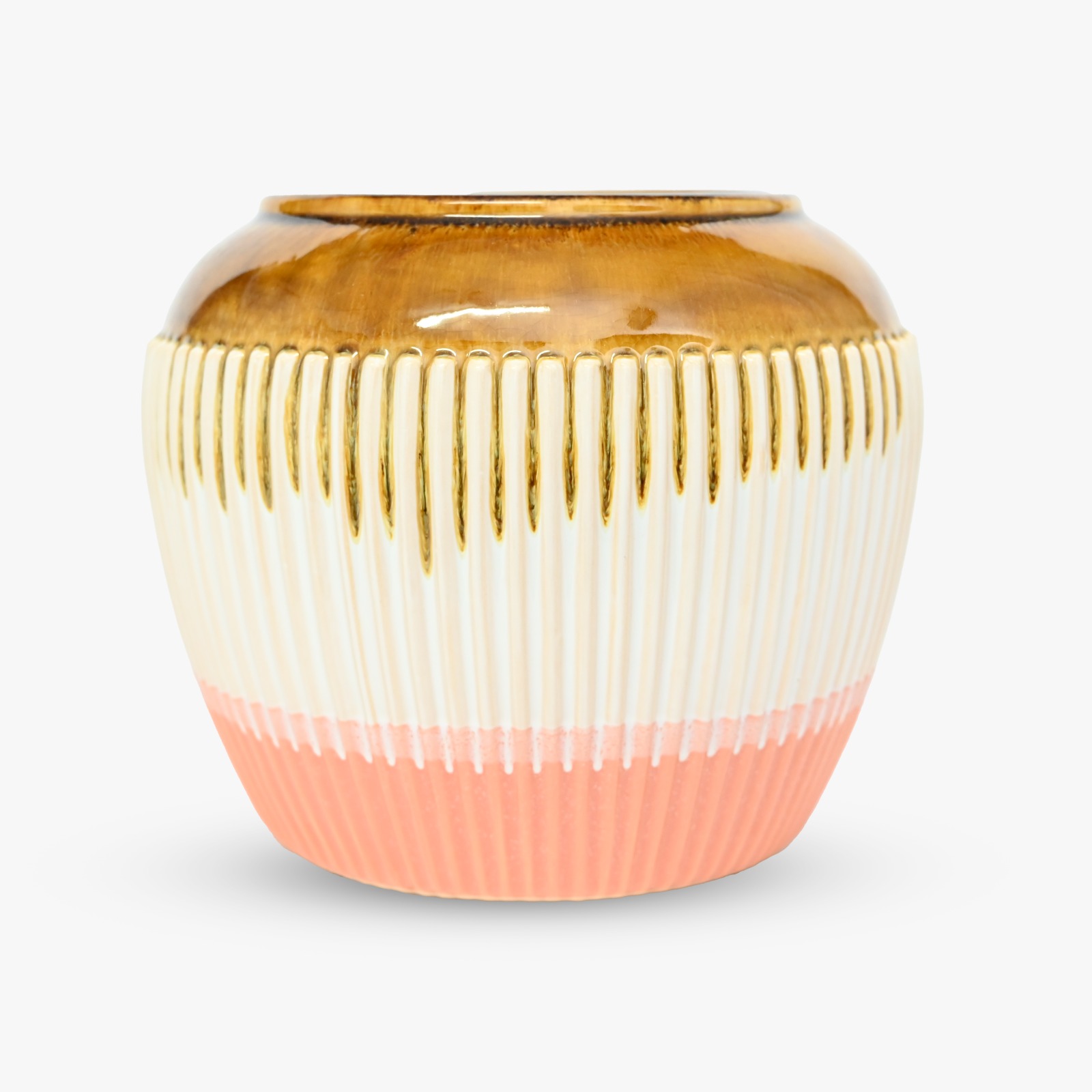 A round ceramic vase featuring a ribbed texture and a soft gradient of brown, white, and peach—perfect for stylish home décor and floral arrangements.